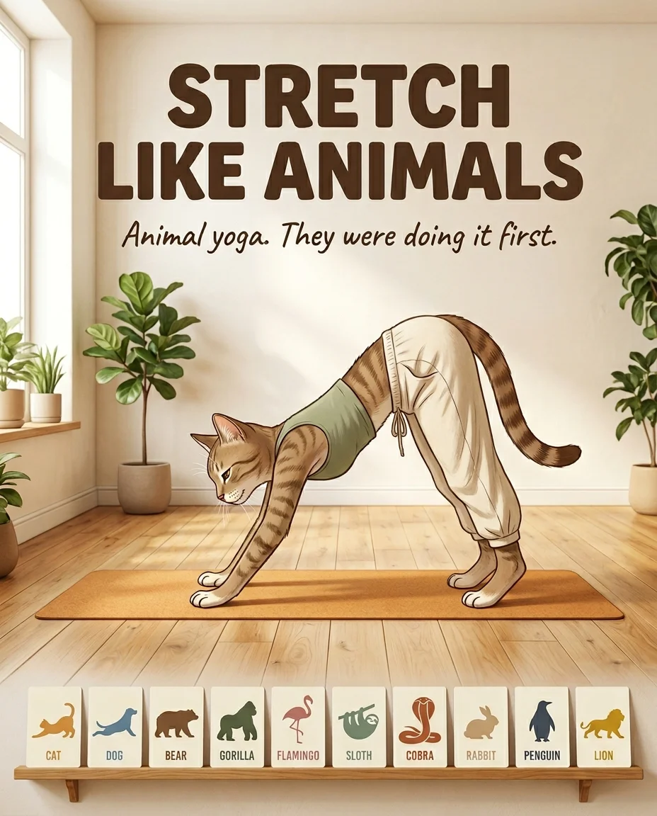 Stretch Like Animals is ten of those. Ten animals, ten movements borrowed from them, translated honestly into something a human body can try.
