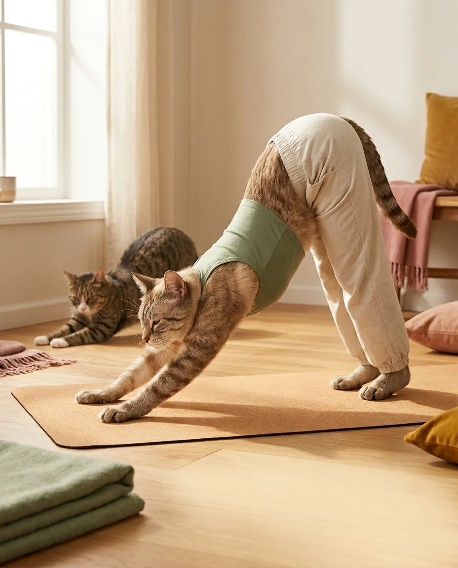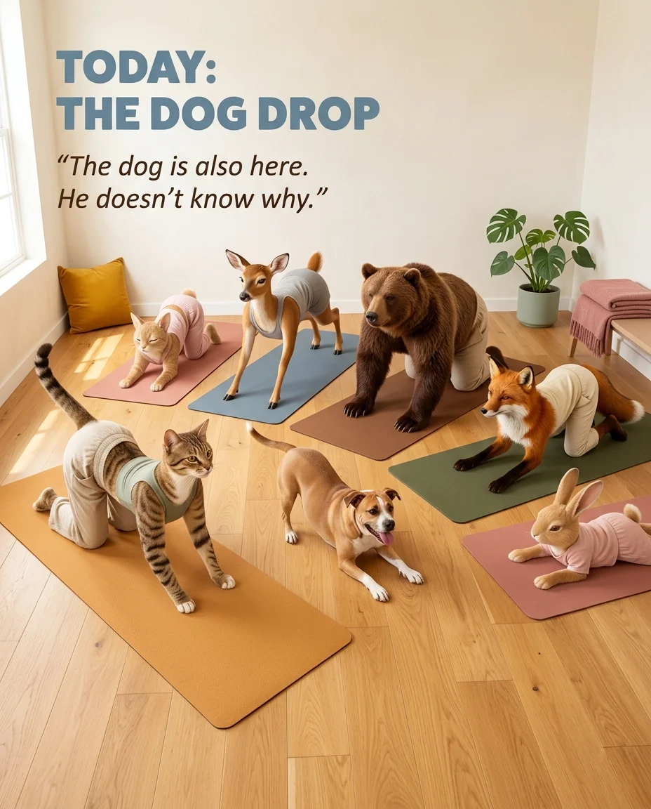 Not metaphorically. The cat arches because it's a cat. The dog drops because it's a dog. Each sequence shows you the animal in its specific stretch — and then asks you to try the same thing, scaled to a human body.